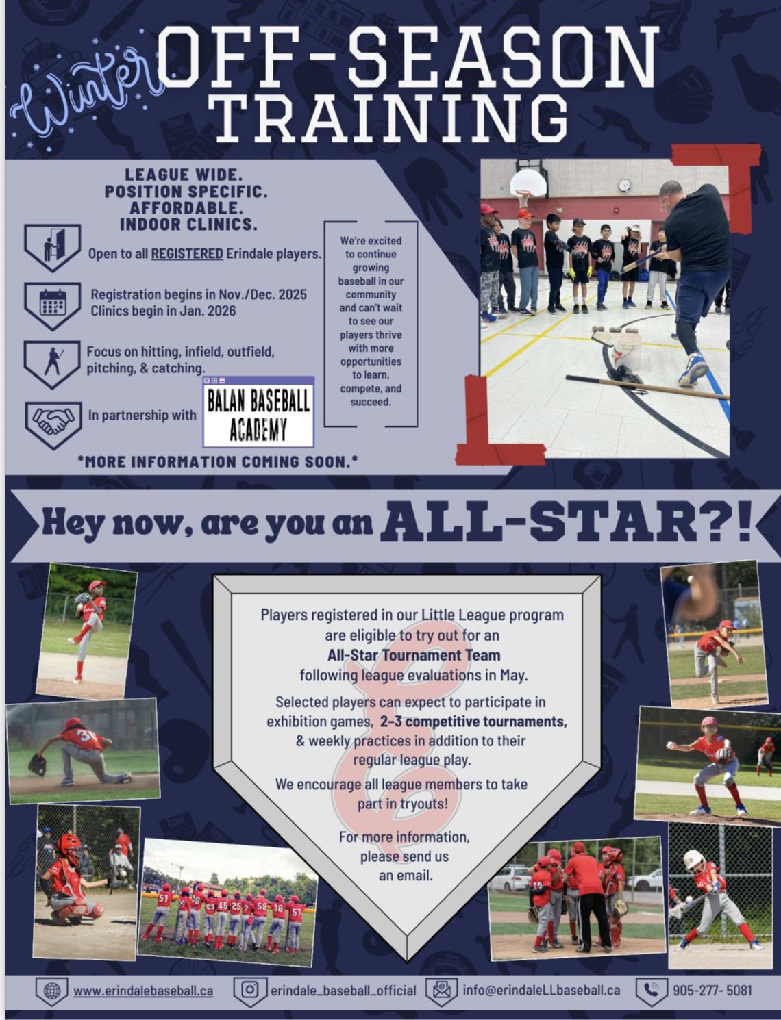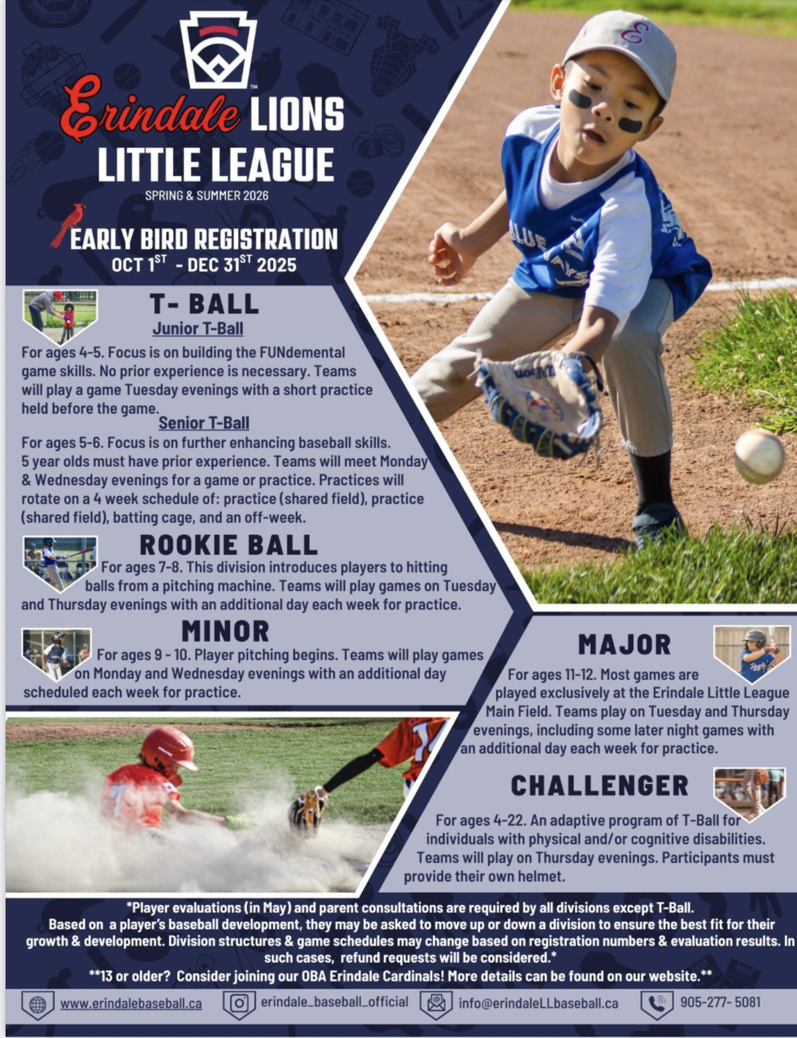 Registration opens October 1st. Please contact the registrar (registrar@erindalellbaseball.ca) if you have any questions.